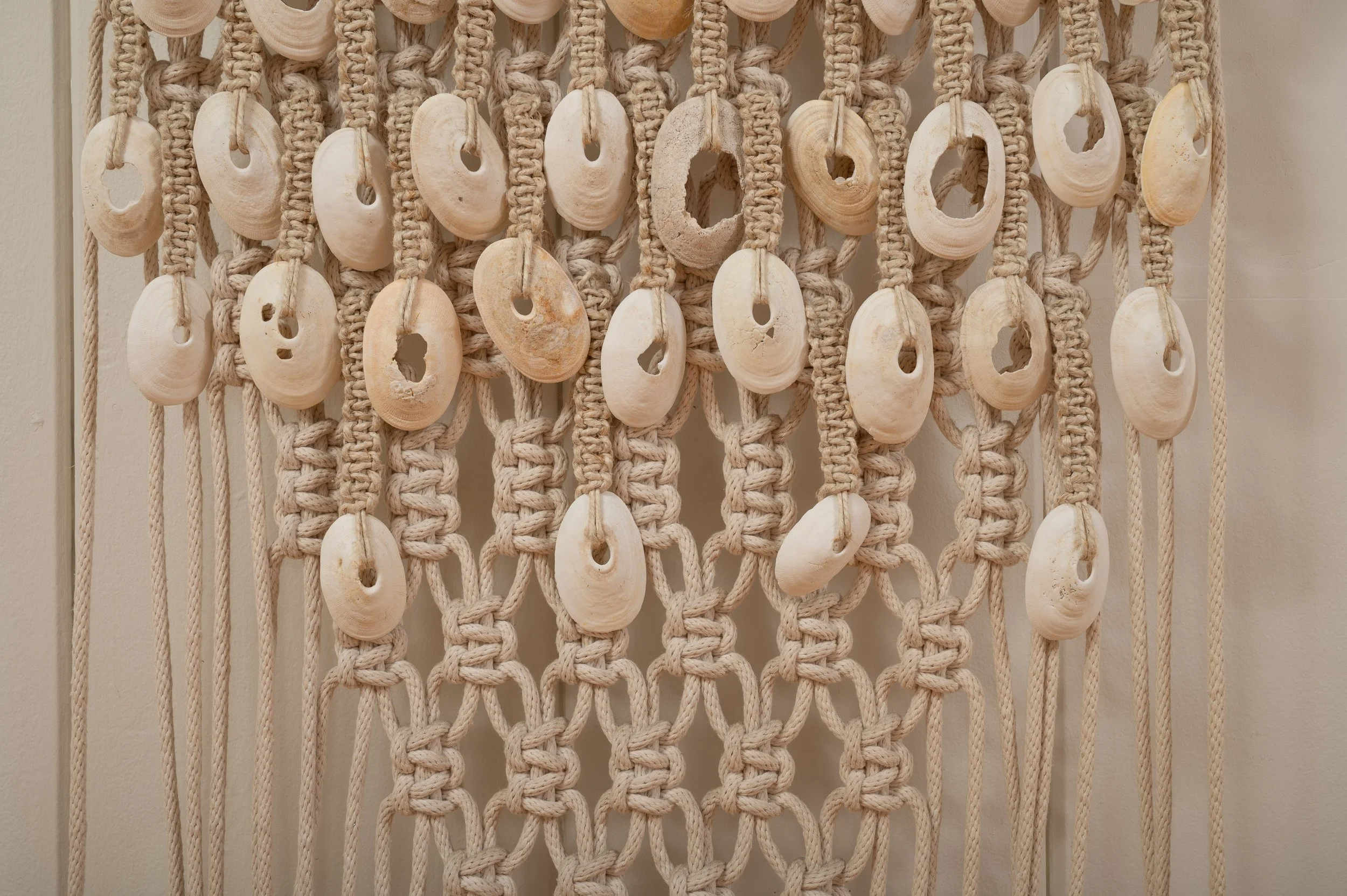A self-described “beach person,” Olarte is drawn irresistibly to tide pools; he recognizes in every one a perfectly contained world constructed by the vagaries of water and rock. Inspired by this microcosmic significance, he frequently incorporates into his artwork the detritus he has lovingly collected on beaches over the course of years. Detritus has become the central concept upon which several of his series are based. In his hands these sea-salvaged objects become the aquatic artifacts that characterize his hanging sculptures. Each piece, whether a delicate seashell or a piece of wave-tumbled driftwood, is treated with respect, as coequal elements of an infinity of integrated life cycles. These bits from the sea and shore are often knotted into his macrame art. He doesn’t drill holes into any natural element of the earth, shells or rocks, but only uses their natural or eroded holes and openings.